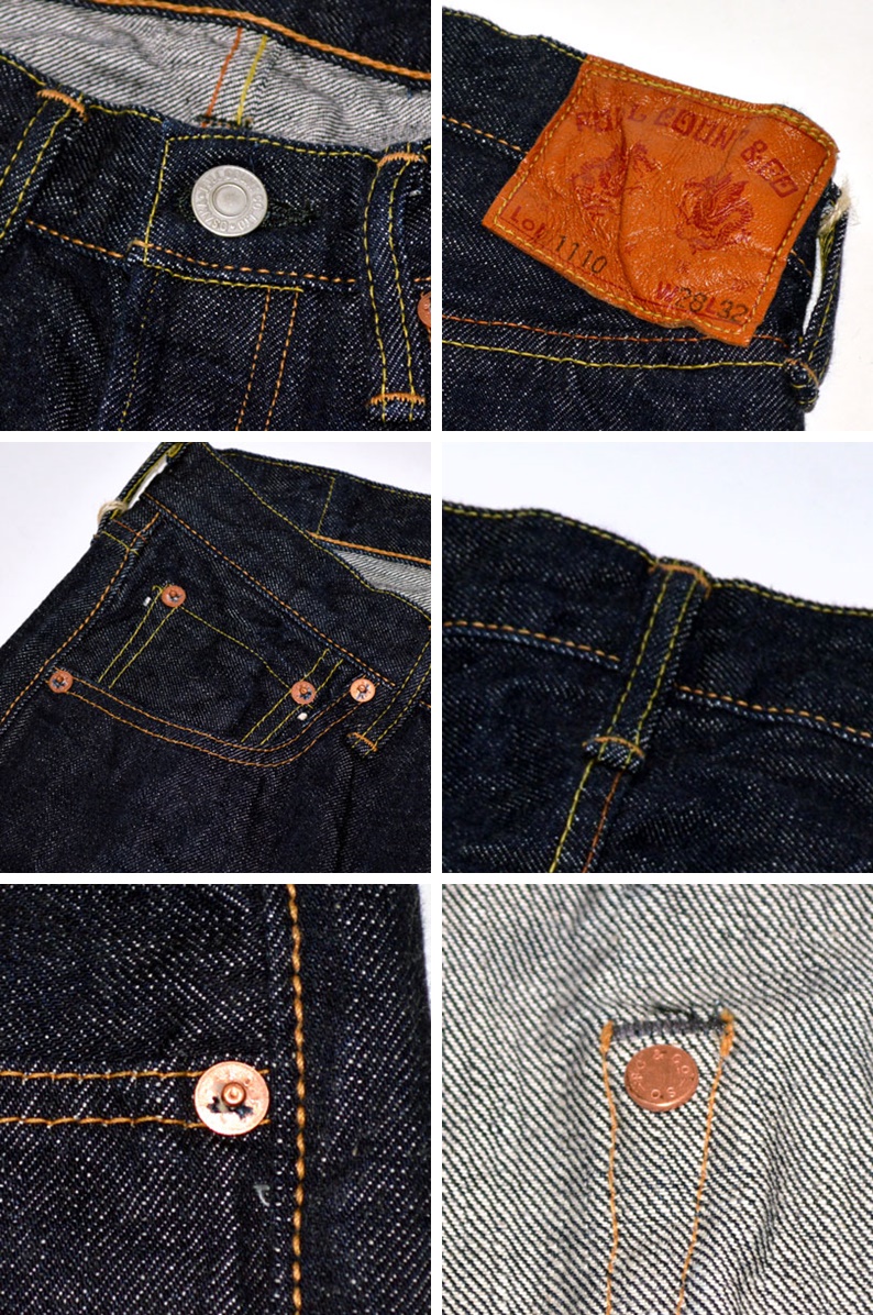 ・品番:1110 ・ジンバブエコットン100% ・日本製 ・ディテール 革パッチ、銅製リベット、ボタンフライ、綿糸縫製、セルビッチ、隠しリベット