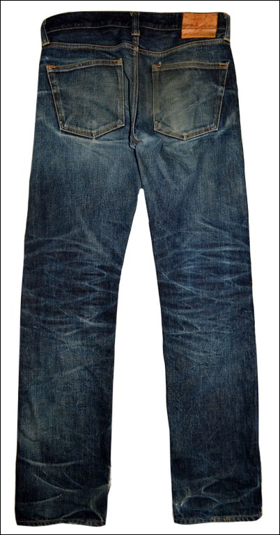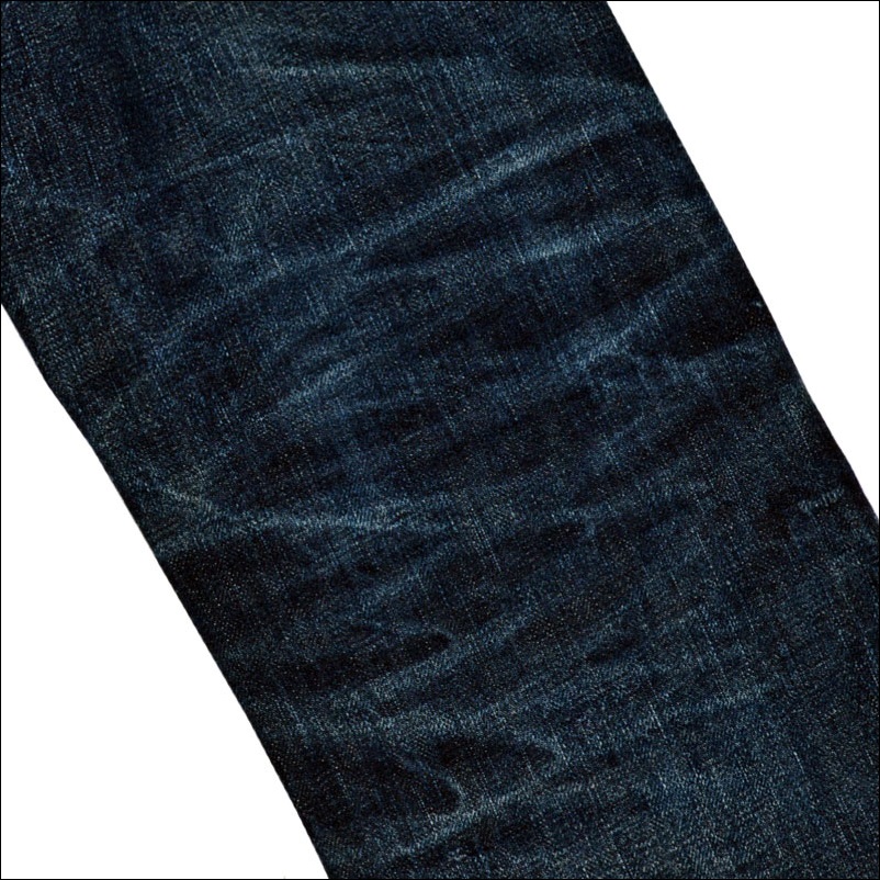 JAPAN BLUE、JB0701の色落ちサンプルです。 JAPAN BLUEの中では、BASICなストレート。ややタイト目にしており、一般的なストレートよりもスッキリと穿きこなせます。 ジーンズならではの武骨さを出すために アメリカ産コットンを使用。このラフなアメリカ綿を、やや強めに紡績することで、さらに強度を高め、 ムラの形状は少し激しめになります。 こうすることでアメリカ産コットンを、風合い、色落ちともに、「ジーパンのための糸」にしていったこだわりの生地になります。 経は青味の強いIDを極限まで濃色にロープ染色で染上げる。こうすることで、ブルーが真っ直ぐにエイジングしていきます。 織りは旧式力織機を使用し、打ち込みは限界まで糸をつめる。 原綿~紡績~染め~織り、全ての工程で、武骨でラフな生地作りを行っています。