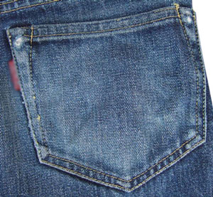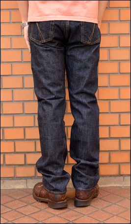 イエローとオレンジの2色ステッチ、セルビッチや裏をスレーキで補強したコインポケット、ヒップポケットの隠しリベットなどオリ