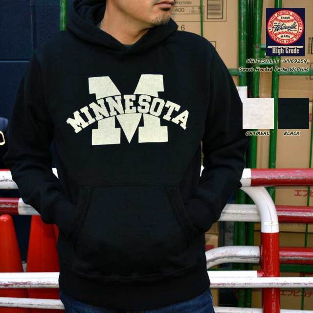 定番のWV67729生地を使用しており、そこにカレッジデザインのプリントを施したホワイツビルらしいパーカーになっています。
